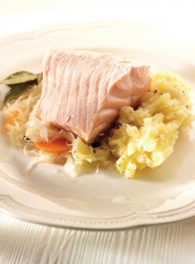 Serveer de zuurkool met de zalm en de aardappelpuree.